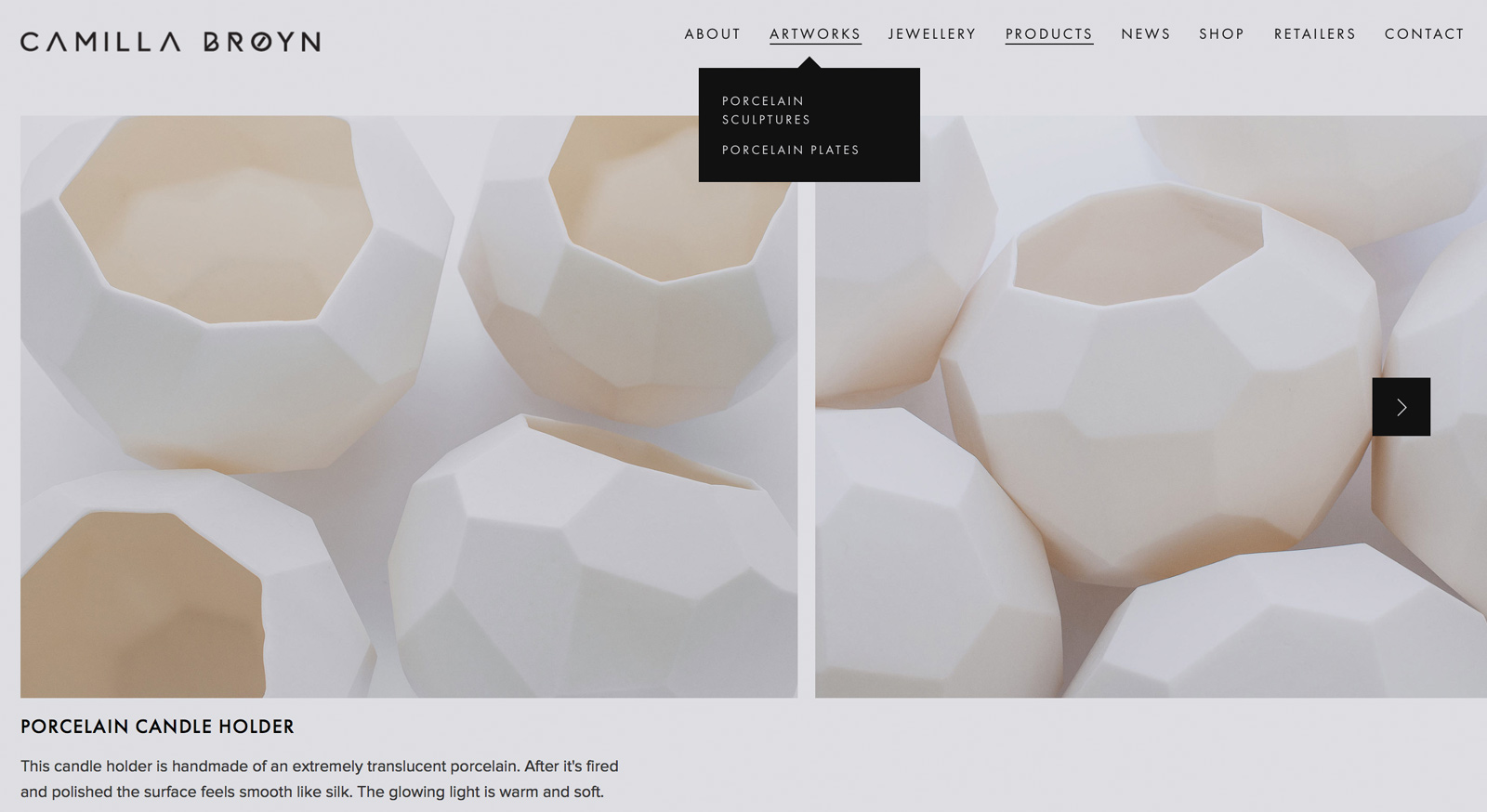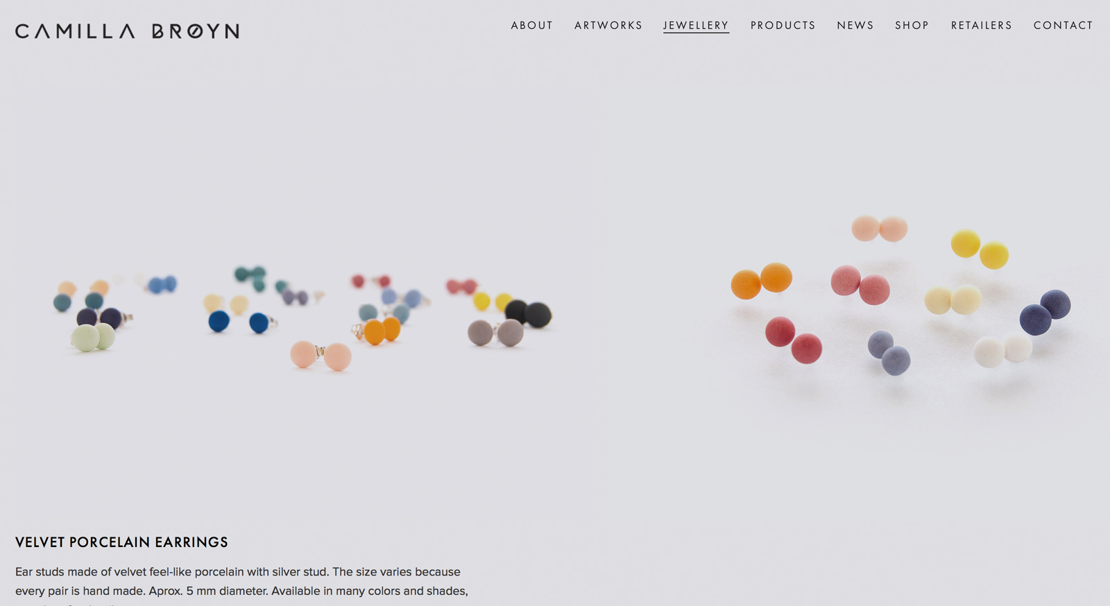Camilla Brøyn is a Gothenburg based Norwegian ceramist, producing ceramic / porcelain artworks, jewellery and day to day products. Pale Grain was assigned to re-brand her company to feature the variety and details of her works.